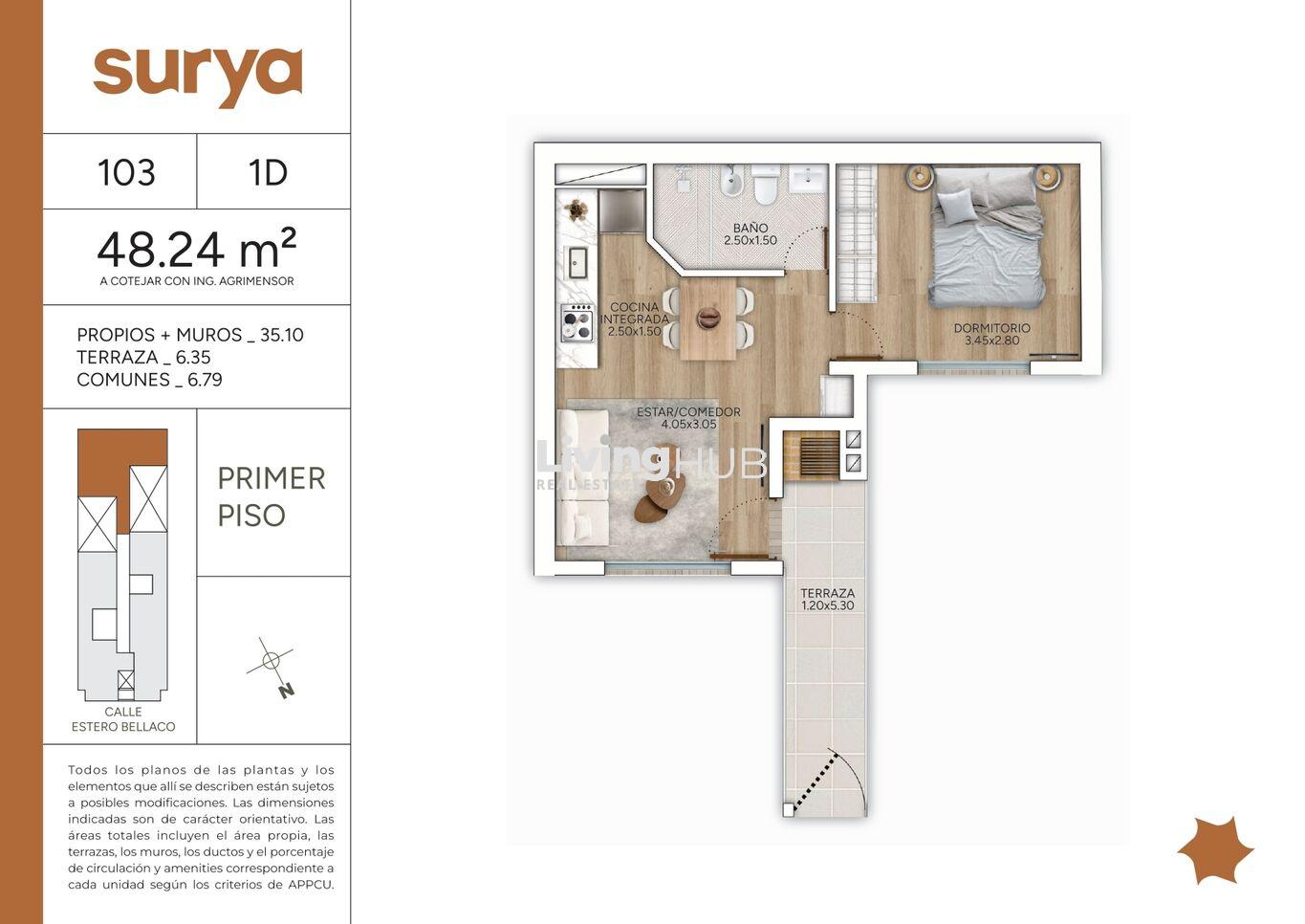 Unidad 103, se encuentra en primer piso por escalera, se accede por la terraza que cuenta con parrillero de uso exclusivo, de ahí ingresamos al apartamento por el living comedor. Cocina integrada, la misma se entrega con muebles bajo y sobre mesada, anafe, horno y campana. Baño completo, dormitorio de buenas dimensiones.