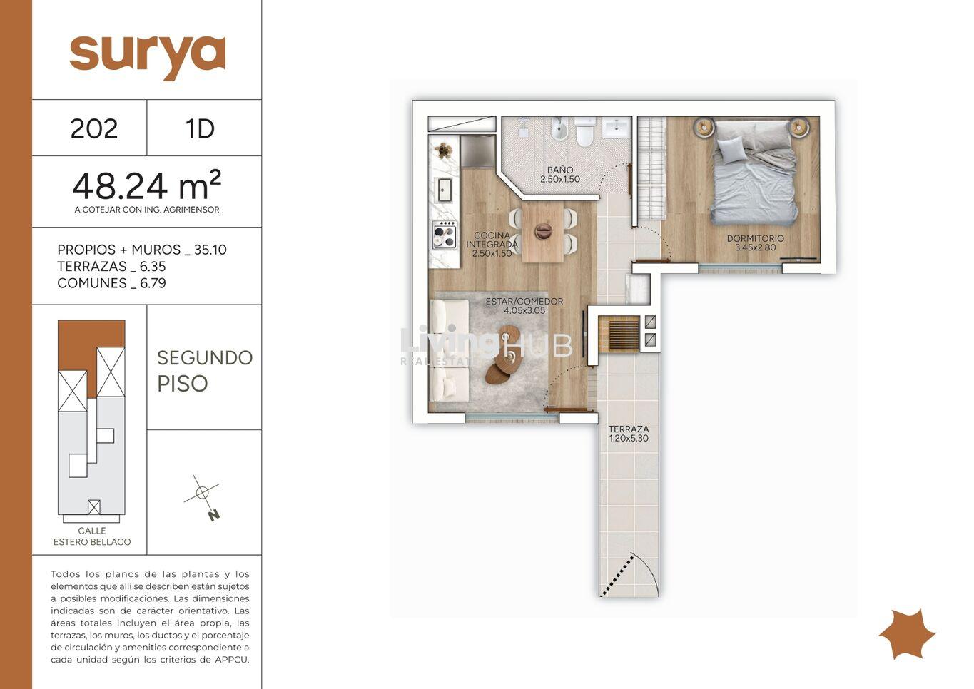 Unidad 202, se encuentra en primer piso por escalera, se accede por la terraza que cuenta con parrillero de uso exclusivo, de ahí ingresamos al apartamento por el living comedor. Cocina integrada, la misma se entrega con muebles bajo y sobre mesada, anafe, horno y campana. Baño completo, dormitorio de buenas dimensiones.