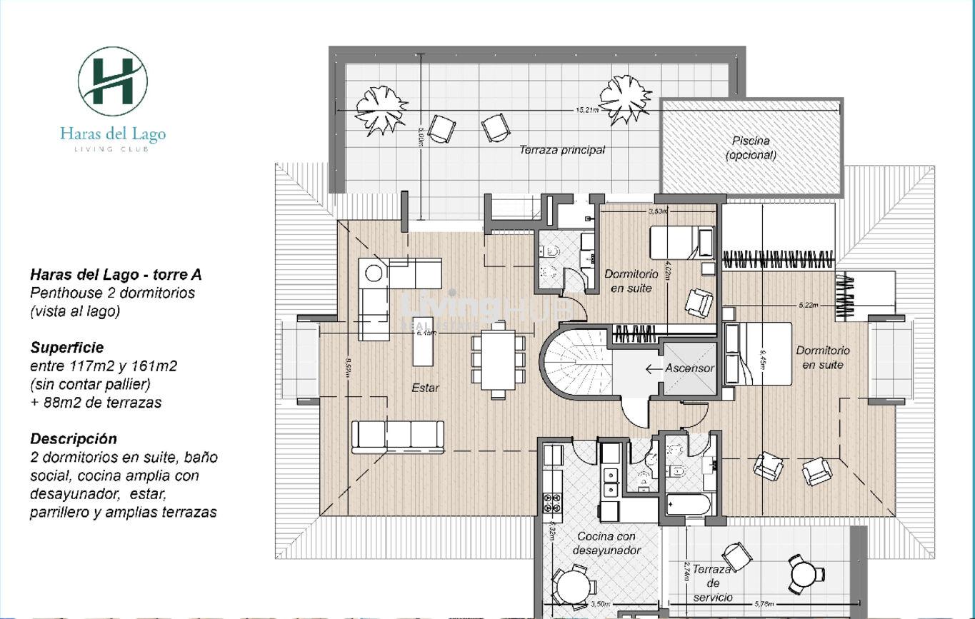 Se ofrece exclusivo penthouse de 2 dormitorios en Haras del Lago, un barrio privado que combina seguridad, naturaleza y excelente conectividad.La unidad cuenta con un amplio living-comedor con salida a múltiples terrazas, proporcionando luminosidad y espacios de esparcimiento únicos. La cocina es definida y dispone de desayunador. Además, incluye un baño social.